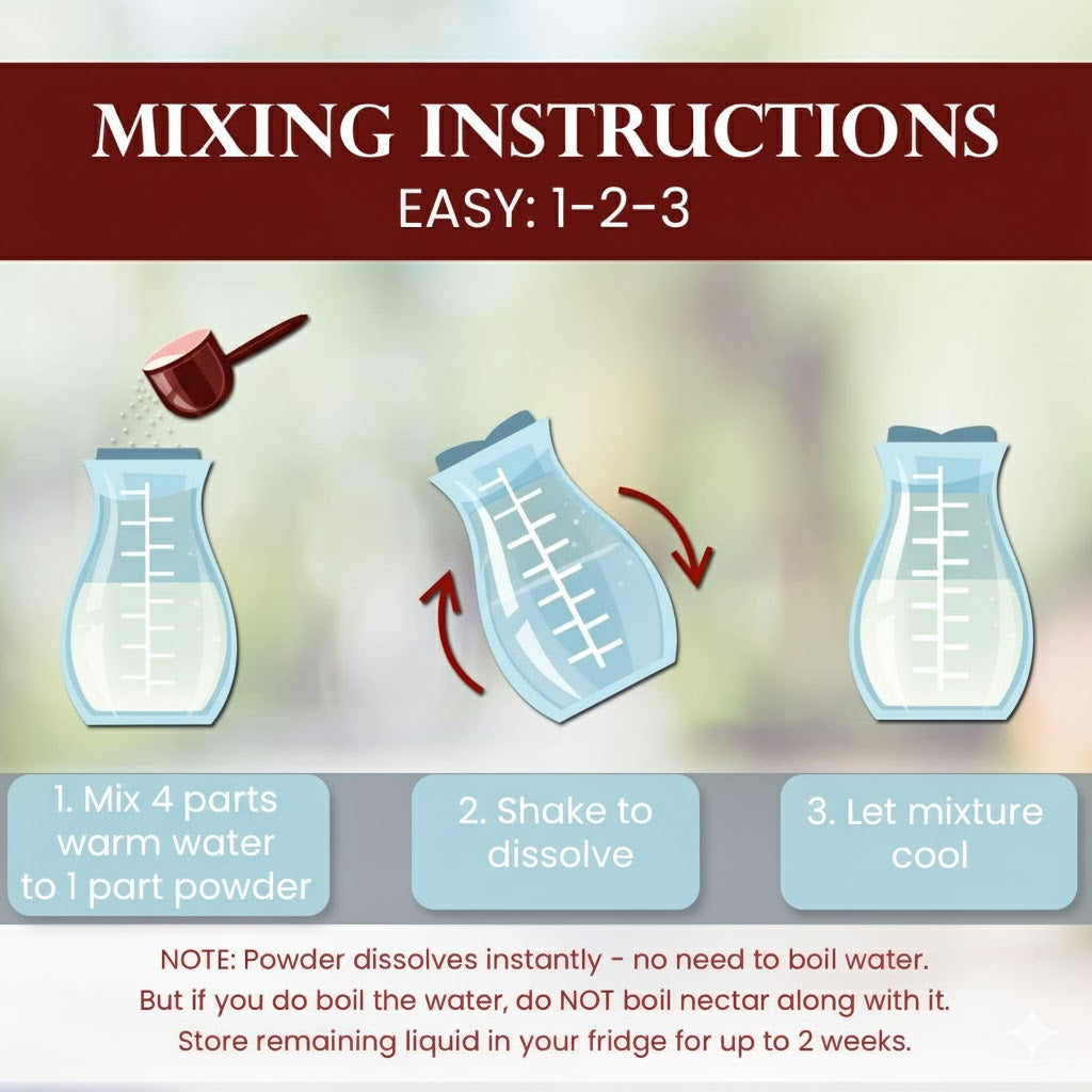 Here's how easy it is: Rinse your feeder with warm water, dissolve one packet in 4 cups of warm water, fill and hang. That's it. Store extra nectar in the fridge and you're ready whenever your hummingbirds stop by.